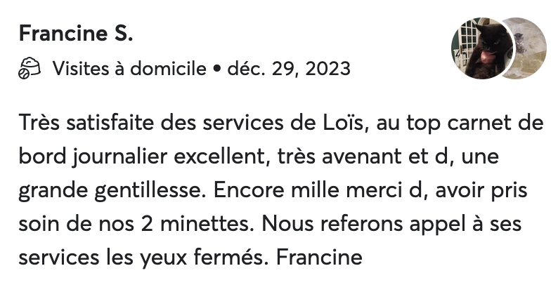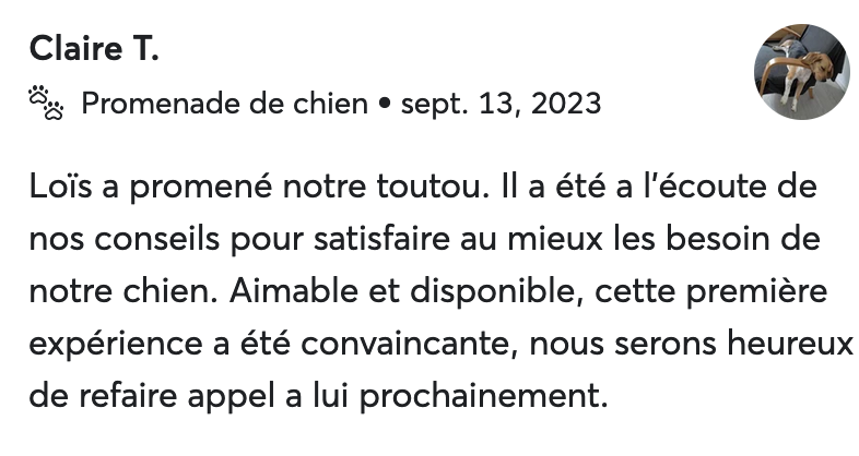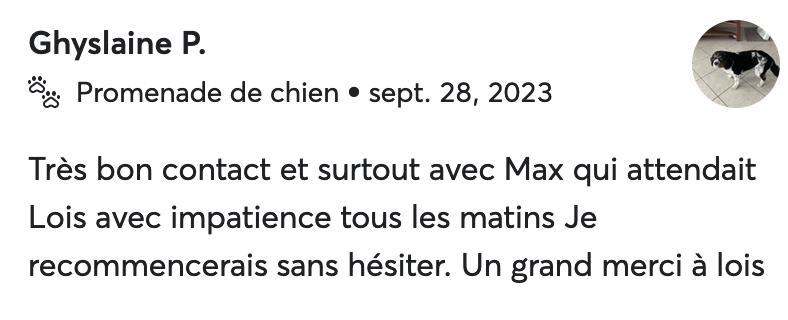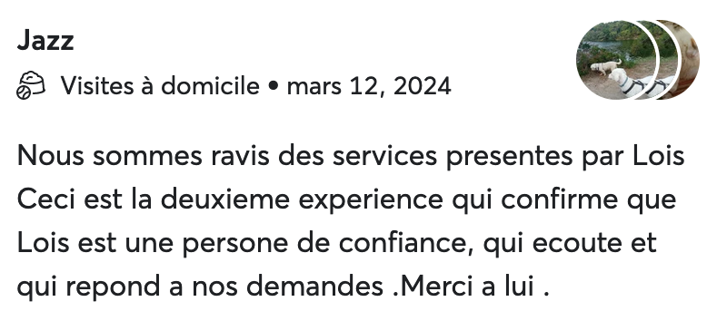 Bonjour, moi, c’est Loïs (au milieu sur la photo), votre partenaire de confiance pour la garde de vos animaux depuis 2022. Si vous faites appel à mes services pour prendre en charge vos précieux compagnons, sachez que je prendrai soin d’eux mieux que de mes propres chiens (qui sont pourris-gâtés).